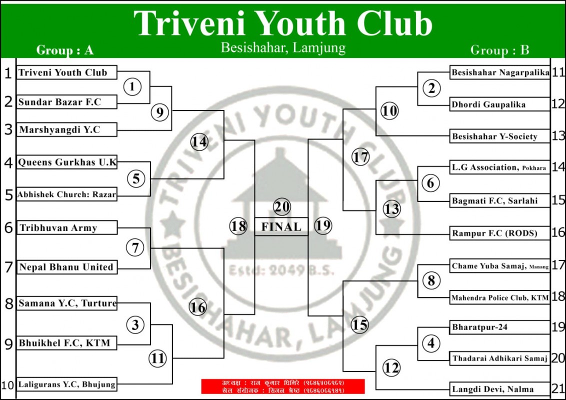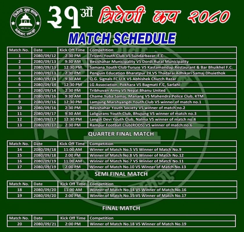 त्रिवेणी क्लवले प्रतियोगिताको तयारी अन्तिम चरणमा पुगेको जानकारी दिएको छ । क्लवका अध्यक्ष राजकुमार घिमिरेले खेल तालिका समेत सार्वजनिक भइसकेको जानकारी दिए ।