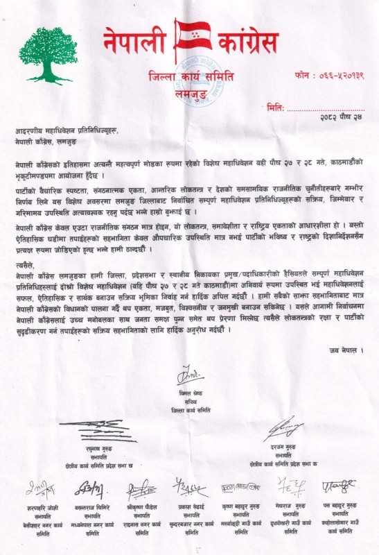 संस्थापन पक्ष र बिशेष महाधिवेशन पक्षधर दुवैले बिशेष महाधिवेशनमा सहभागी हुन र नहुन आग्रह गरे पनि यस अघि बिशेष महाधिवशेन माग गर्दै हस्ताक्षर गर्नेहरूले महाधिवेशनमा सहभागिता जनाउने भएका हुन् । बिशेष महाधिवेशनकाे पक्ष बिपक्षमा लमजुङका कांग्रेस नेताहरु विभाजित छन् ।