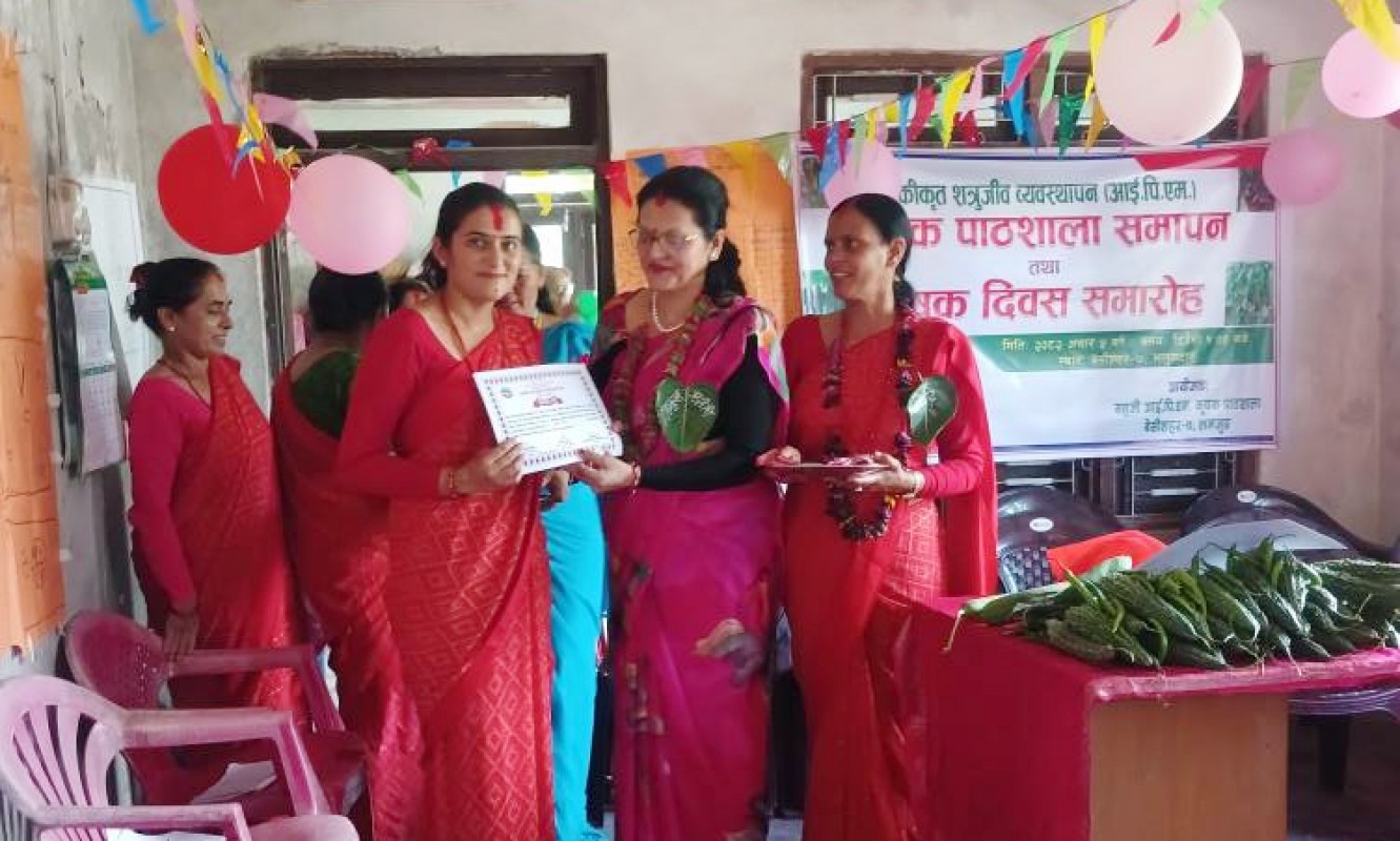 मिलिजुली आईपिएम कृषक पाठशाला अध्यक्ष रिता पौडेलको अध्यक्षतामा भएको समापन कार्यक्रममा जिल्ला समन्वय अधिकारी रोशन अर्याल, कोलेनिका प्रमूख भवराज जोशी, कृषि ज्ञान केन्द्र लमजुङका प्रमूख सुदिप खतिवडा, बाली संरक्षण प्रयोगशाला पोखराका सालीग्राम अधिकारी, भेटेरीनरी अस्पताल तथा पशुसेवा विज्ञ केन्द्र लमजुङका प्रमुख डा सुनिल न्यौपाने लगायतको विशेष उपस्थिती रहेको थियो ।