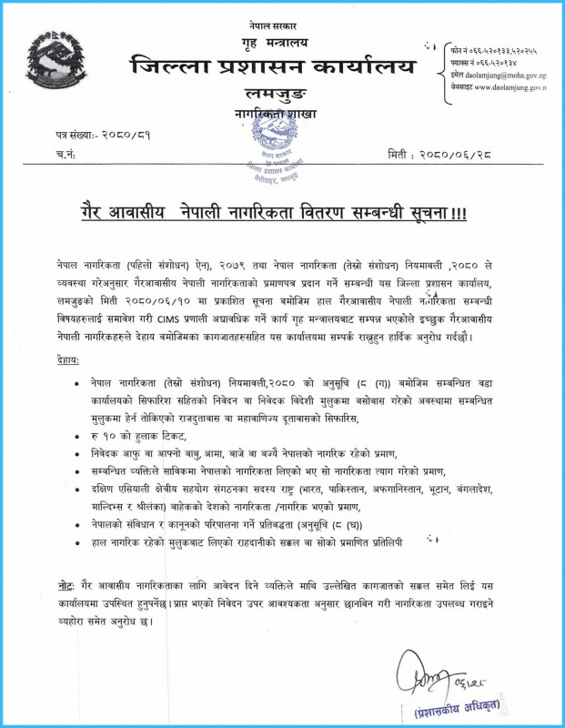 बेसीशहर । गैर आवासीय नेपालीहरूका लागि जिल्ला प्रशासन कार्यालय लमजुङले पनि गैरआवासीय नागरिकता दिने भएकाे छ। कार्यालयले एक सूचना जारी गर्दै नागरिकता लिन इच्छुक गैर आवासीय नेपालीलाइ आवश्यक कागजपत्रसहित कार्यालयमा सम्पर्क गर्न अनुराेध गरेकाे छ ।