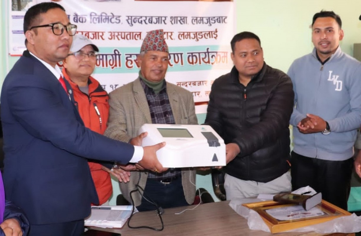यहाँको सुन्दरबजार अस्पताललाई नेपाल बैंक लिमिटेड सुन्दरबजार शाखाले मधुमेह जाँच गर्ने उपकरण उपलब्ध गराएपछि त्यहाँका नागरिकलाई सहज हुने भएको हो । बैंकले सामाजिक उत्तरदायित्व कार्यक्रम अन्तरगत ४ लाख रुपैयाँ पर्ने मधुमेह जाच गर्ने HBA1C उपकरण प्रदान गरेको हो । शुक्रबार सुन्दरबजार अस्पतालमा आयोजित एक समारोहबीच नेपाल बैंक लिमिटेड सुन्दरबजारका शाखा प्रबन्धक रिम बहादुर थापाले सुन्दरबजार नगरपालिकाका मेयर कृष्ण कोइराला, अस्पतालका अध्यक्ष विष्णुकुमार श्रेष्ठ र अस्पतालका प्रमुख डा. हाेमबहादुर गुरूङलाई हस्तान्तरण गरे ।