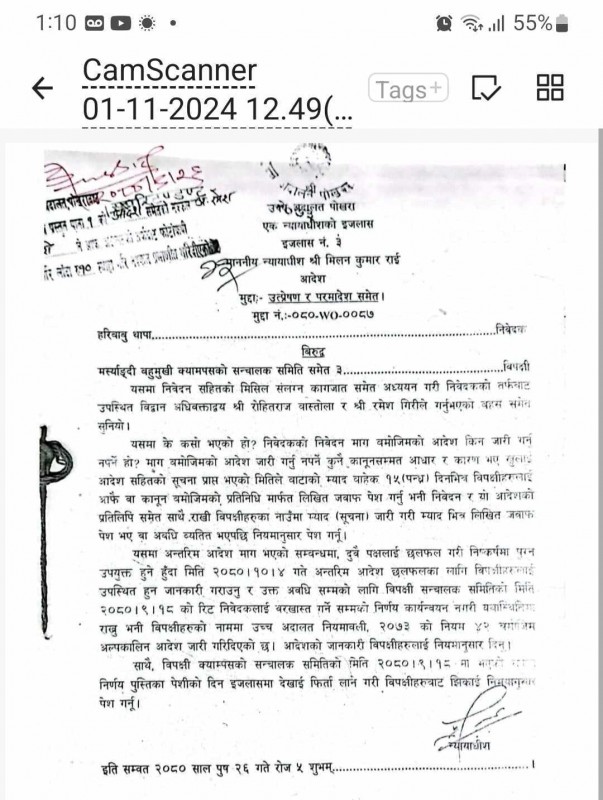 याे निर्णय विरूद्ध थापाले उच्च अदालत पाेखरामा रिट हालेका थिए । रिटकाे सुनुवाइ गर्दै उच्च अदालत पाेखराले सञ्चालक समितिलाइ उक्त निर्णय कार्यान्वयन नगर्न नगराउन बिहीबार अन्तरिम आदेश जारी गरेकाे हाे । उच्च अदालतका न्यायाधीश मिलन कुमार राइकाे इजलासले निवेदककाे माग बमाेजिमकाे आदेश जारी गर्न नपर्ने कानुनसम्मत आधार र कारण भए १५ दिनभित्र लिखित जवाफ पेश गर्न आदेश दिएकाे छ ।