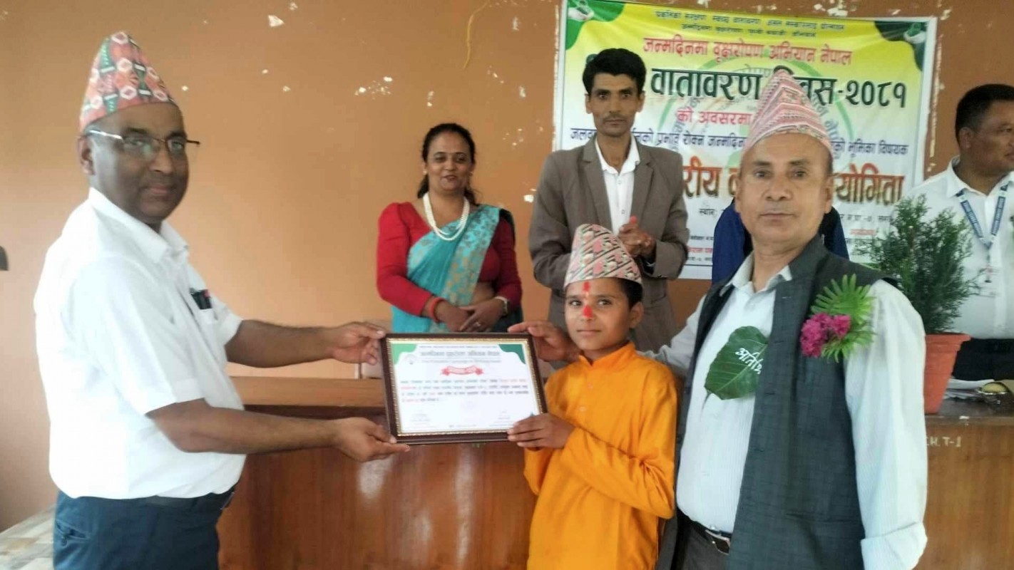 जलबायु परिवर्तनको प्रभाव रोक्न जन्मदिनमा वृक्षरोपण अभियानको भूमिका विषयक कविता प्रतियोगितामा पाणिनि संस्कृत मावि दुराडाँडाका आशिष भट्टले प्रथम, अर्थली प्याराडाइज बोर्डिङ बेसीशहरका रमित पाण्डेले द्वितीय र विद्याज्योति मावि सुन्दरवजार ५ तार्कुका सुस्मिता न्यौपानेले तृतीय स्थान पाए । त्यस्तै भू.पू. सैनिक आवासिय मा.वि की अनामिका गुरुङ र आदर्श बाल माविकी सेविका जोशीले सान्त्वना स्थान प्राप्त गरे । प्रतियाेगितामा सामुदायिक तथा सस्थांगत विद्यालयका २५ जना छात्रछात्रा सहभागि थिए । प्रतियोगितामा प्रथम, द्वितीय, तृतीय र सान्त्वना स्थान प्राप्त गर्ने छात्रछात्रालाइ क्रमशः ५ हजार, ३ हजार, २ हजार र १/१ हजार नगद पुरस्कार र प्रमाणपत्र प्रदान गरिएको थियाे ।