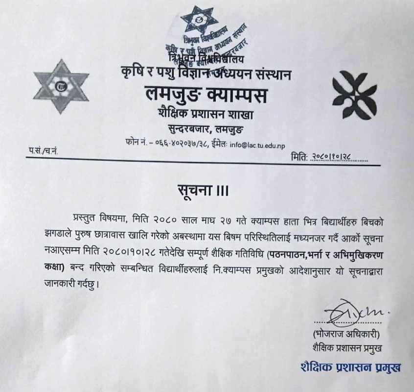 बेसीशहर, माघ २९ । लमजुङको सुन्दरबजारमा रहेको कृषि तथा पशु विज्ञान अध्ययन संस्थान, लमजुङ क्याम्पस अनिश्चितकालका लागि बन्द गरिएकाे छ ।