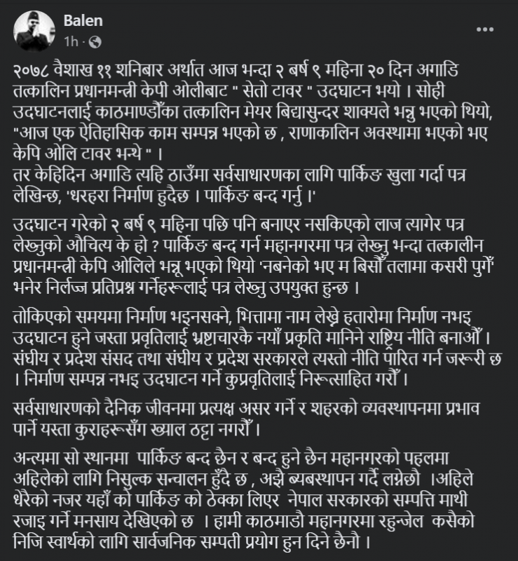 बालेनले सामाजिक सञ्जालमा लेखेका छन्– "तोकिएको समयमा निर्माण भइनसक्ने, भित्तामा नाम लेख्ने हतारोमा निर्माण नभइ उदघाटन हुने जस्ता प्रवृतिलाई भ्रष्टाचारकै नयाँ प्रकृति मानिने राष्ट्रिय नीति बनाऔँ । संघीय र प्रदेश संसद तथा संघीय र प्रदेश सरकारले त्यस्तो नीति पारित गर्न जरूरी छ । निर्माण सम्पन्न नभइ उदघाटन गर्ने कुप्रवृतिलाई निरूत्साहित गरौँ ।"