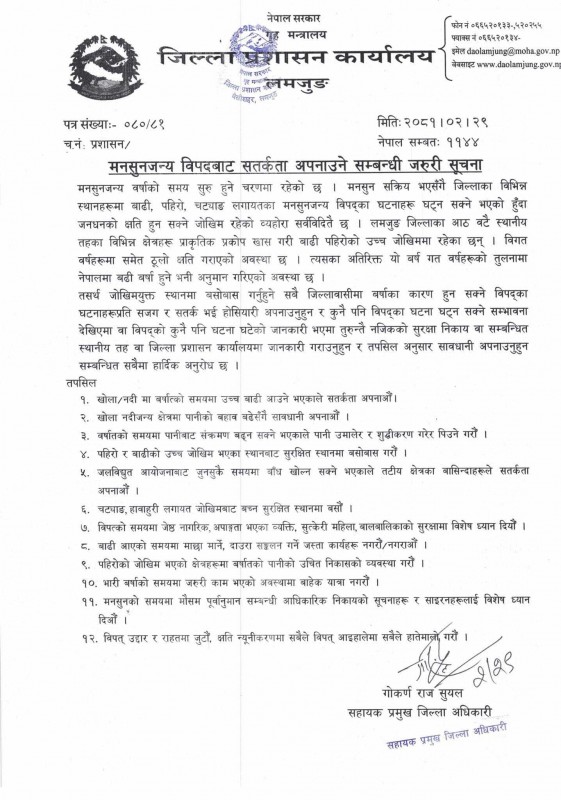 प्रशासन कार्यालयले एक जरुरी सूचना प्रकाशित गरी यो बर्ष गत बर्षहरुको तुलनामा नेपालमा बढी बर्षा हुने अनुमान गरिएको अवस्था रहेकोमा सचेत गराउँदै सम्भावित विपदका घटनामा सज र सतर्क भई होसियारी अपनाउन आग्रह गरेको हो । कार्यालयले कुनै घटना घटेको जानकारी भएमा तुरुन्तै नजिकको सुरक्षा निकाय वा सम्बन्धित स्थानीय तह वा जिल्ला प्रशासन कार्यालयमा जानकारी गराउन तथा आवश्यक सावधानी अपनाउन अनुरोध गरेको छ ।