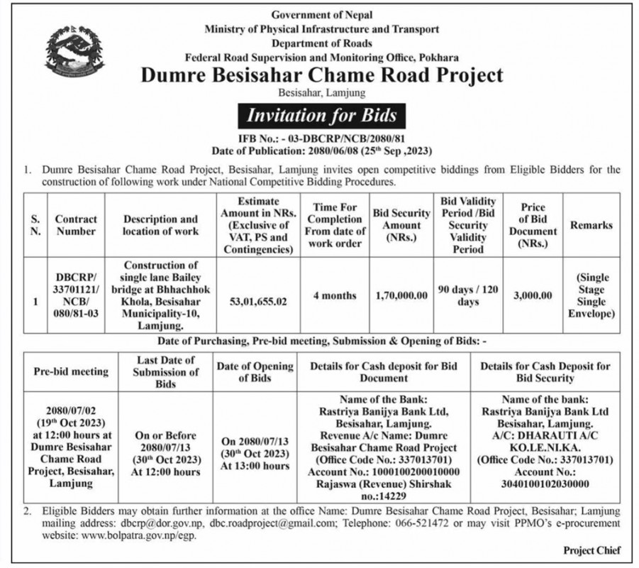 भाचोक खोलामा पुल नहुँदा यातायातमा समस्या हुँदै आएको थियो । स्थानीय बासीन्दासहित जनप्रतिनिधि, राजनीतिक दलका नेताहरुको पटक पटकको डेलिगेशनपछि भौतिक योजना तथा निर्माण मन्त्रालयले भाचोक खोलामा बेलिब्रिज निर्माणमा सहमति दिएको हो । मन्त्रालयले डुम्रे–बेसीशहर–चामे सडक योजना मार्फत बेलीव्रिज निर्माण गर्न बोलपत्र आह्वानसमेत गरेको डुम्रे बेसीशहर चामे सडक योजनाले जनाएको छ ।