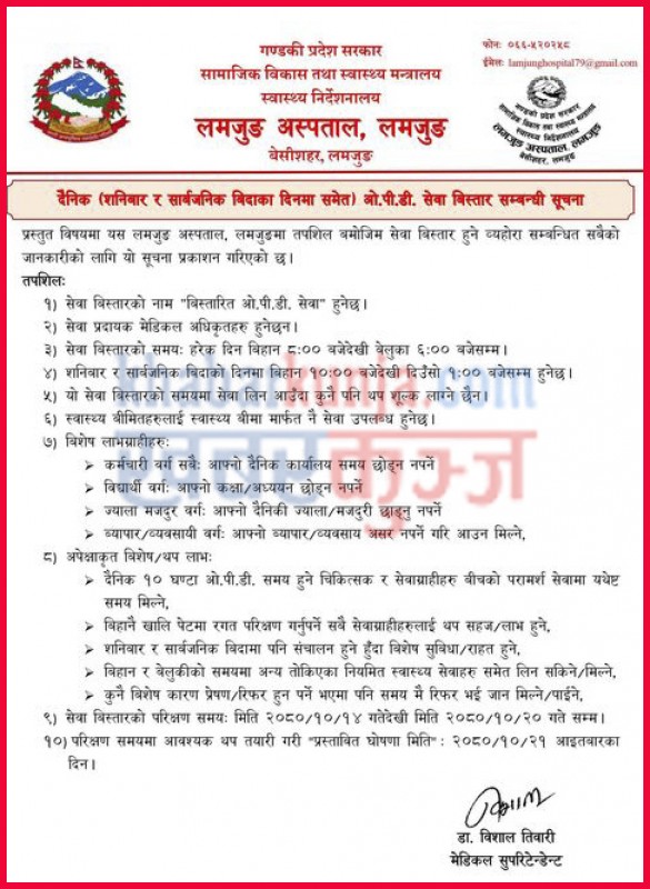 अस्पतालले एक सूचना जारी गर्दै विस्तारित ओपिडि सेवा बिहान ८ बजेदेखि बेलुकी ६ बजेसम्म सञ्चालन गर्ने तयारी गरिएको जनाएको छ । यस अन्तर्गत शनिबार र सार्वजनिक विदाका दिनमा समेत ओपिडि सेवा बिहान १० बजेदेखि दिउसो १ बजेसम्मका लागि सञ्चालन गरिने अस्पतालका मेडिकल सुपरिटेन्डेण्ट डा. विशाल तिवारीले जानकारी दिए ।