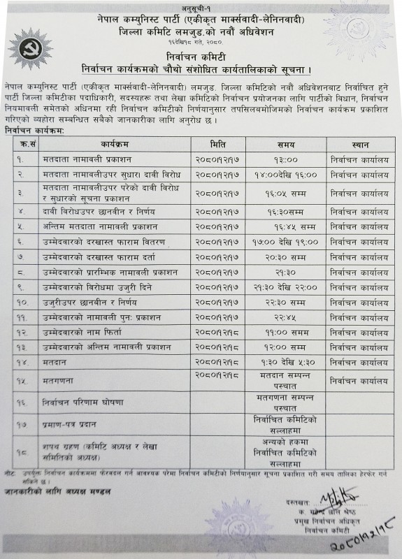 बेसीशहर, चैत १८ गते । नेकपा एमाले जिल्ला कमिटी लमजुङको नवौं अधिवेशनमार्फत नेतृत्व चयनका लागि केहीबेरपछि मतदान हुने भएको छ ।सर्बसम्मत रुपमा नेतृत्व चयन हुन नसकेपछि निर्वाचन प्रक्रियामार्फत नेतृत्व चयन गर्न निर्वाचन कमिटीले काम शुरु गरेको हो ।