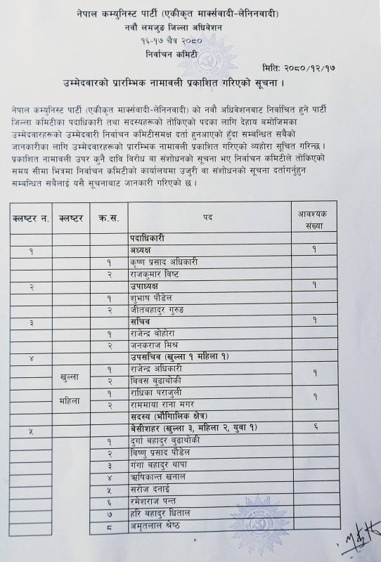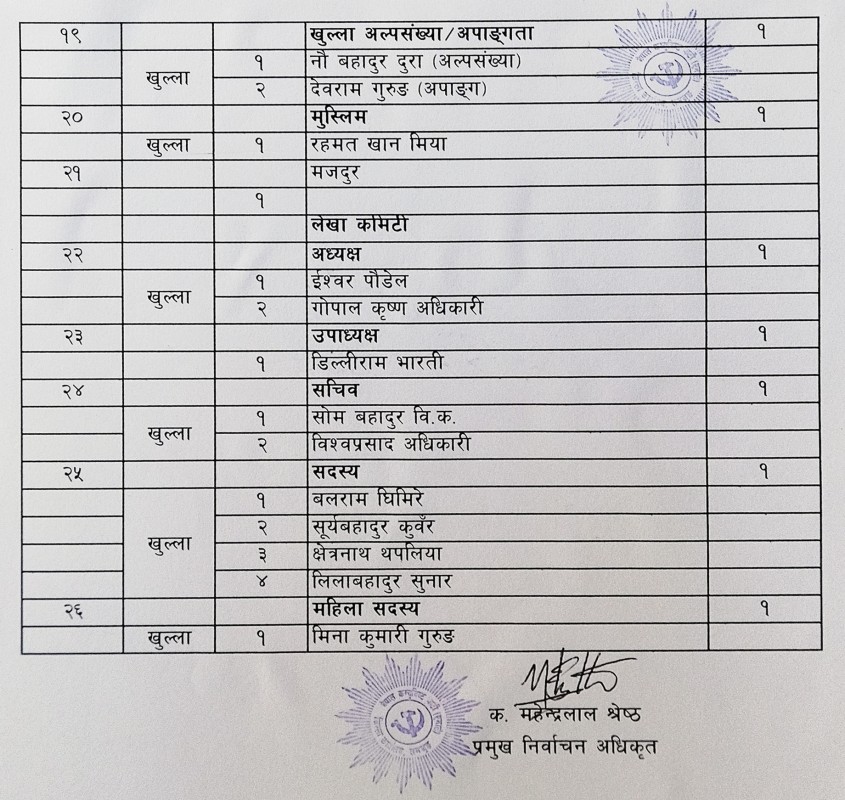 प्रमुख निर्वाचन अधिकृत महेन्द्रलाल श्रेष्ठले केहीबेरमै उमेदवारको अन्तिम नाम प्रकाशन गरिने जानकारी दिए ।