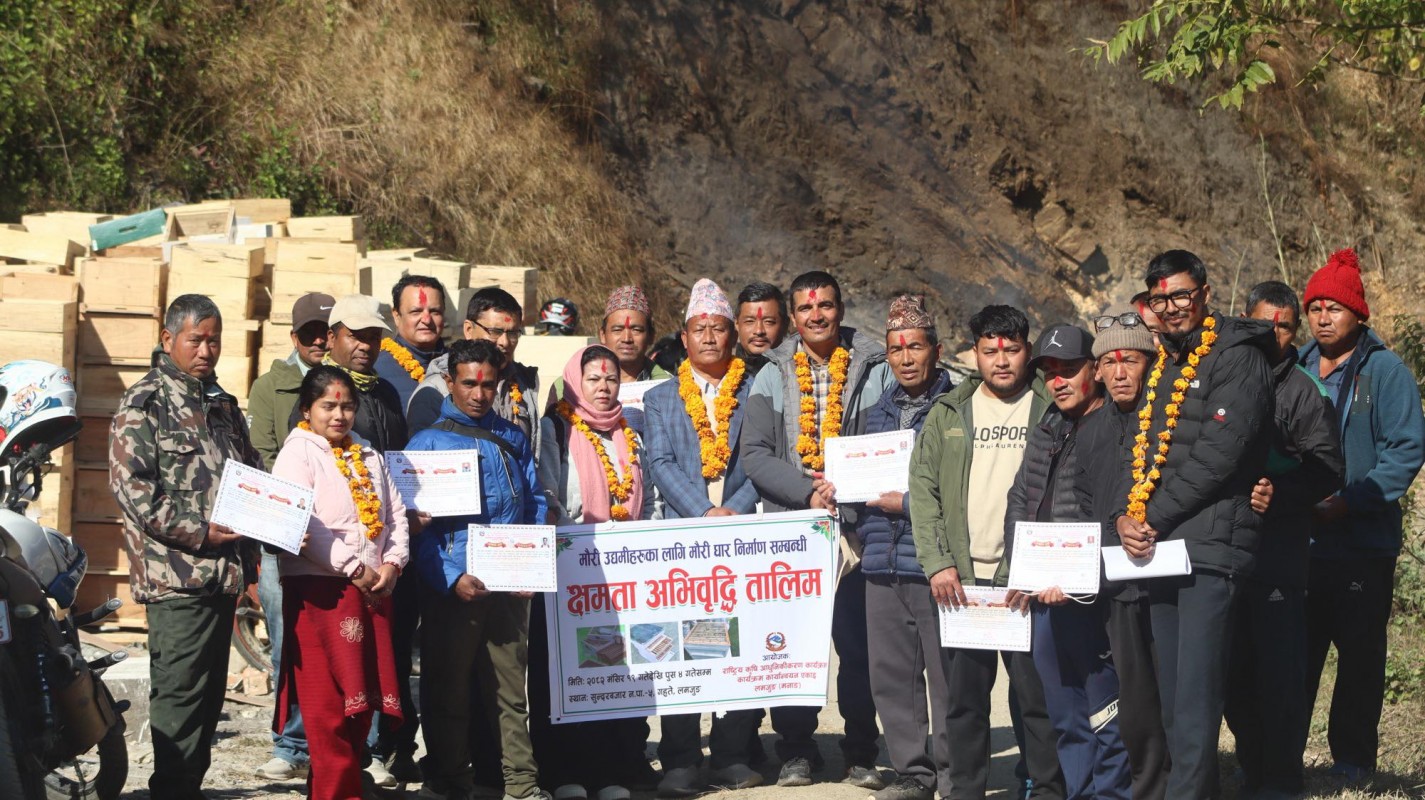 यसैबीच राष्ट्रिय कृषि अधुनिकीकरण परियोजना, परियोजना कार्यान्वयन इकाइ लमजुङ(मनाङ)काे आयोजनामा लमजुङको सुन्दरबजार ५ गहतेमा सञ्चालन भएको मौरी उद्यमीहरूका लागि मौरीघार निर्माण सम्बन्धी १५ दिने क्षमता अभिबृद्धि तालिम शुक्रबार सम्पन्न भएको छ । तालिममा सुजिता माैरीपालन तथा घार उद्याेगका सञ्चालक मीन बहादुर गुरूङ लगायतले तालिम दिएका थिए । तालिममा जिल्लाका विभिन्न स्थानका १५ जना उद्यमीहरूकाे सहभागिता थियाे । तालिमका सहभागीहरूलाइ प्रमुख अतिथि जिल्ला समन्वय समितिका प्रमुख पूर्णबहादुर गुरूङ, राष्ट्रिय कृषि अधुनिकीकरण परियोजना, परियोजना कार्यान्वयन इकाइ लमजुङ(मनाङ)का प्रमुख पद्मनाथ आत्रेयलगायतले प्रमाणपत्र वितरण गरेका थिए ।