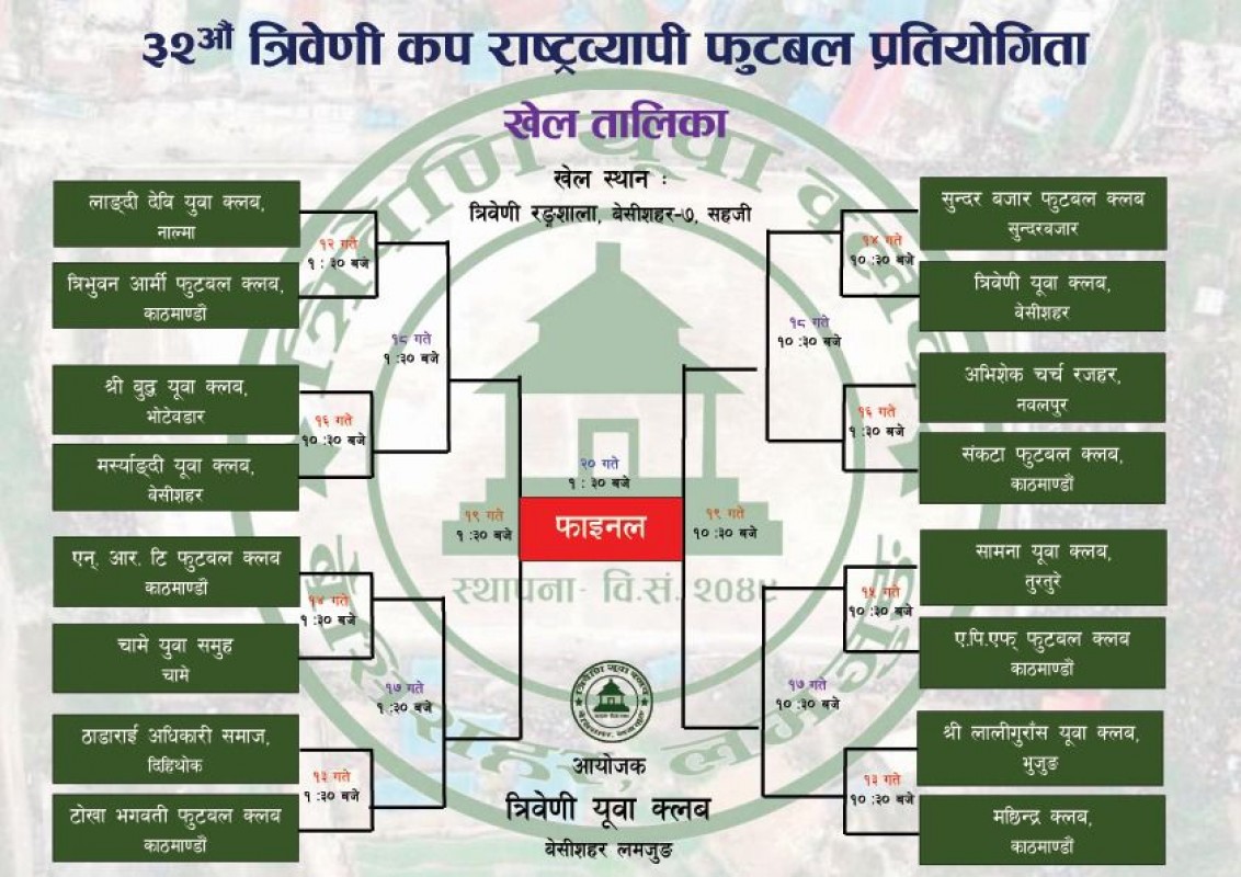 बेसीशहर, पुस ६ गते । गण्डकी प्रदेशकै प्रतिष्ठित र सर्वाधिक पुरस्कार भएको त्रिवेणी कप फुटबल प्रतियोगिताको खेलतालिका सार्वजनिक भएको छ ।