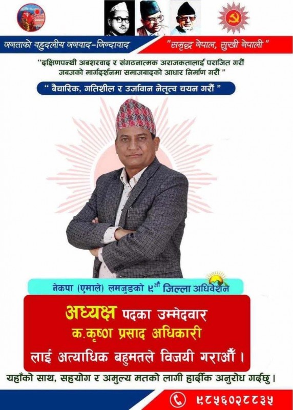 अध्यक्ष पदका प्रत्यासी कृष्णप्रसाद अधिकारी भन्छन्- “सबै एकातिर म अर्कोतिर भए पनि केही छैन, मेरो वेट घट्दैन । म चुनाव जित्छु । मैले २०५४ सालदेखि अनवरत रुपमा पार्टीको लागि खटेको छु मेरो कामको मूल्याङ्कन साथीहरुले गर्नुहुने छ । राजकुमारजीसंग मेरो प्रतिस्पर्धा नै होइन ।”