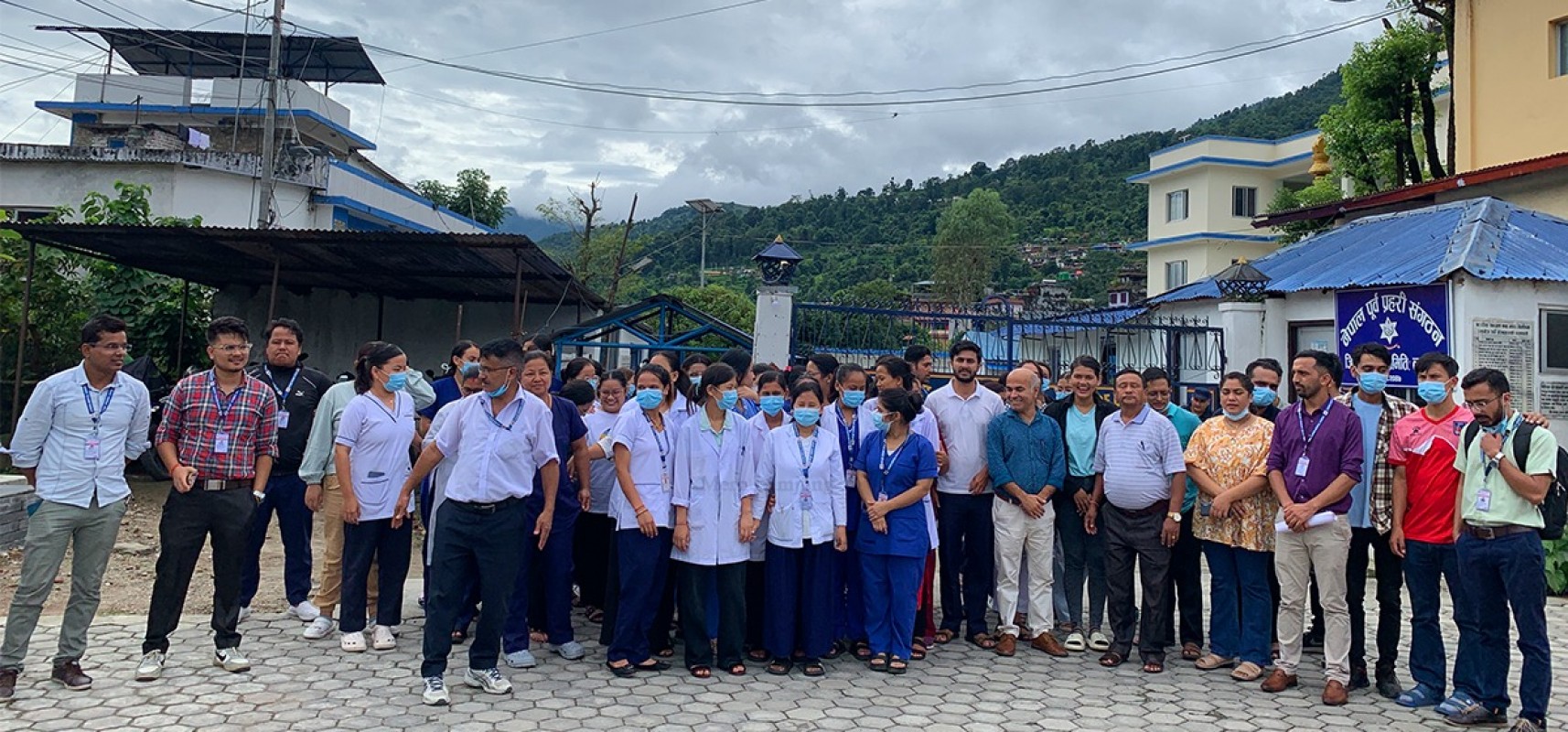 डाक्टरलाइ कुटपिट भएकाे बिराेधमा उजुरी गर्न प्रहरी कार्यालय पुगेका डाक्टर तथा स्वास्थ्यकर्मीहरू