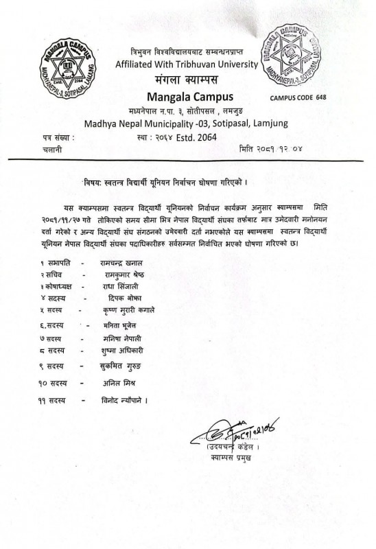 क्याम्पस प्रमुख कँडेलका अनुसार मंगला क्याम्पसको स्ववियू सभापतिमा रामचन्द्र खनाल, सचिवमा रामकुमार श्रेष्ठ र कोषाध्यक्षमा राधा सिंजाली निर्विरोध भएका हुन् । त्यस्तै सदस्यहरुमा दिपक ओझा, कृष्ण मुरारी कगाले, मनिता भुजेल, मनिषा नेपाली, शुष्मा अधिकारी, सुकमित गुरुङ, अनिल मिश्र र विनोद न्यौपाने निर्विरोध निर्वाचित भएका छन् ।