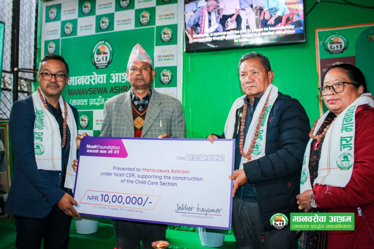 मानव सेवा आश्रमको भवन निर्माणका लागि एनसेलले दियाे १० लाख रुपैयाँ